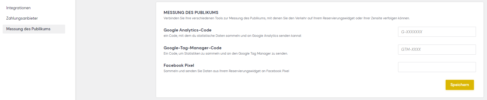 In Ihrem Zenchef-Konto können Sie Ihre Google-Analytics-ID oder Ihren Tag-Manager-Code direkt in Ihren Einstellungen im Bereich Website eingeben. So aktivieren Sie den Datenabruf über Ihre Zenchef-Tools.