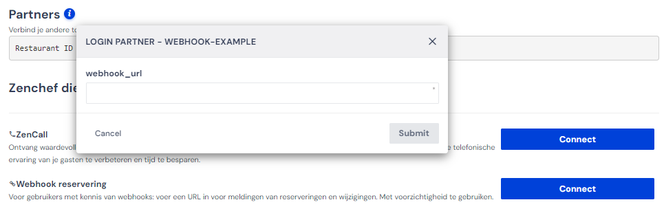 In your Zenchef environment, go through settings to the partners tab. Click the connect button next to 'Webhook reservation' at the top of the page. Paste the link into the field and click save.