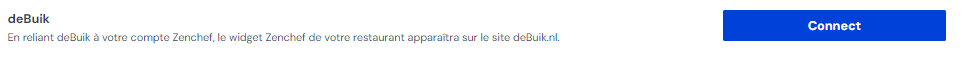 Vous pouvez activer l'intégration avec deBuik dans votre environnement Zenchef via les paramètres et l'onglet partenaire. Vous trouverez le partenaire dans la catégorie "Services de réservation". Cliquez sur le bouton de connexion à côté du partenaire. Fournissez votre Zenchef restaurantId à votre point de contact chez deBuik. L'identifiant de votre restaurant Zenchef se trouve en haut de la place de marché Zenchef.