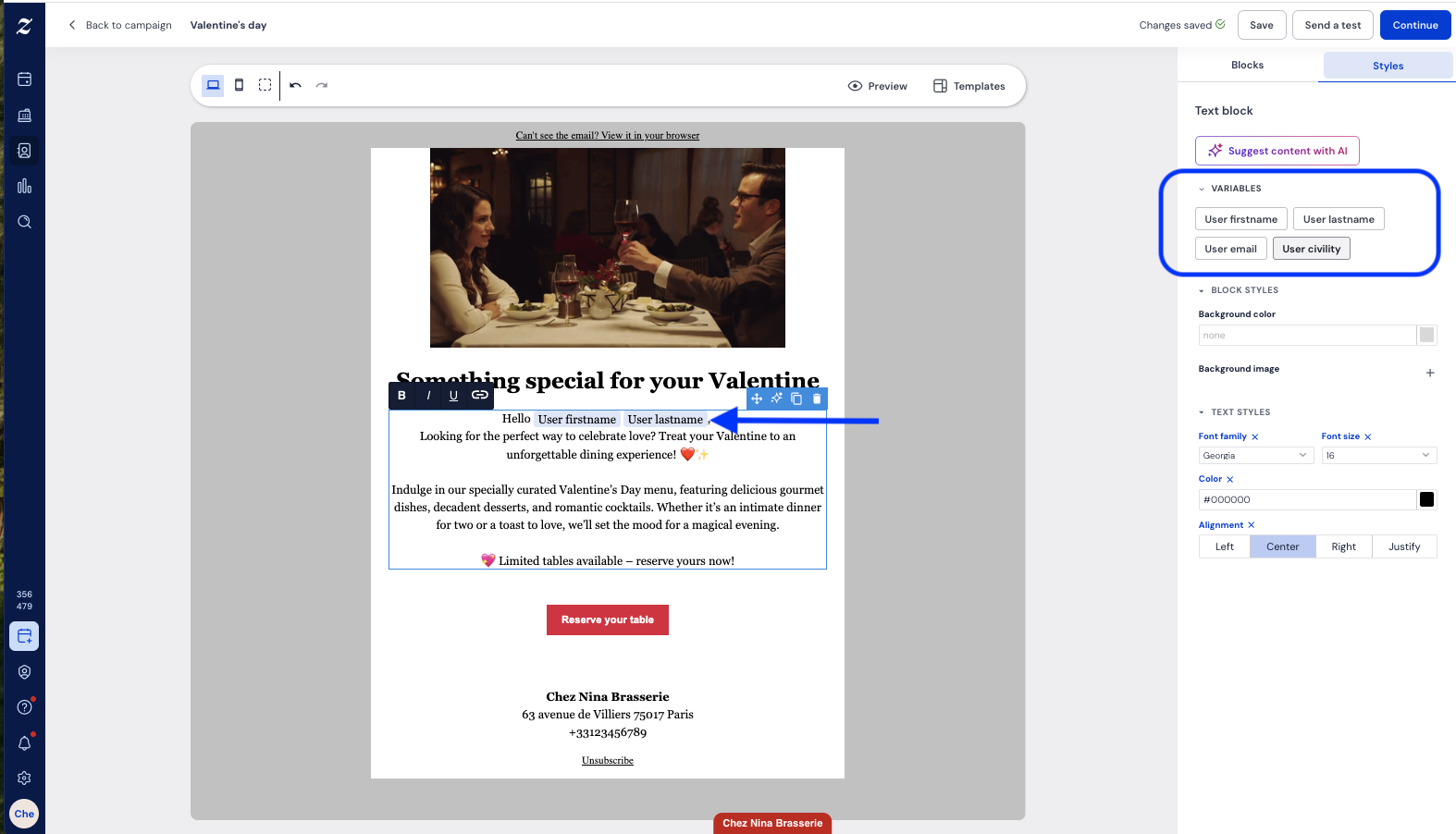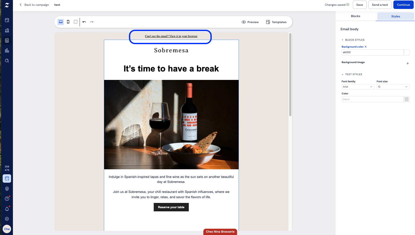 Dans cet article, vous trouverez tout ce dont vous avez besoin pour utiliser les dernières fonctionnalités de campagne email dans Zenchef — y compris les variables de personnalisation, les liens hypertextes en style texte, les mises en page responsive à 2 colonnes, et l'option "Voir dans le navigateur" — afin que vous puissiez envoyer des campagnes qui paraissent personnelles et qui s'affichent parfaitement sur tous les appareils.