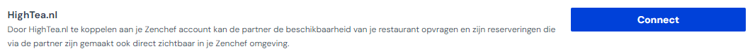 HighTea is aangesloten op de Zenchef API. De partner kan beschikbaarheid ophalen, ervaringen opdoen, reserveringen toevoegen en bijwerken (nopers, datum, aankomsttijd, annuleren) voor aangesloten restaurants. Reserveringen worden gemaakt via de HighTeas widget.