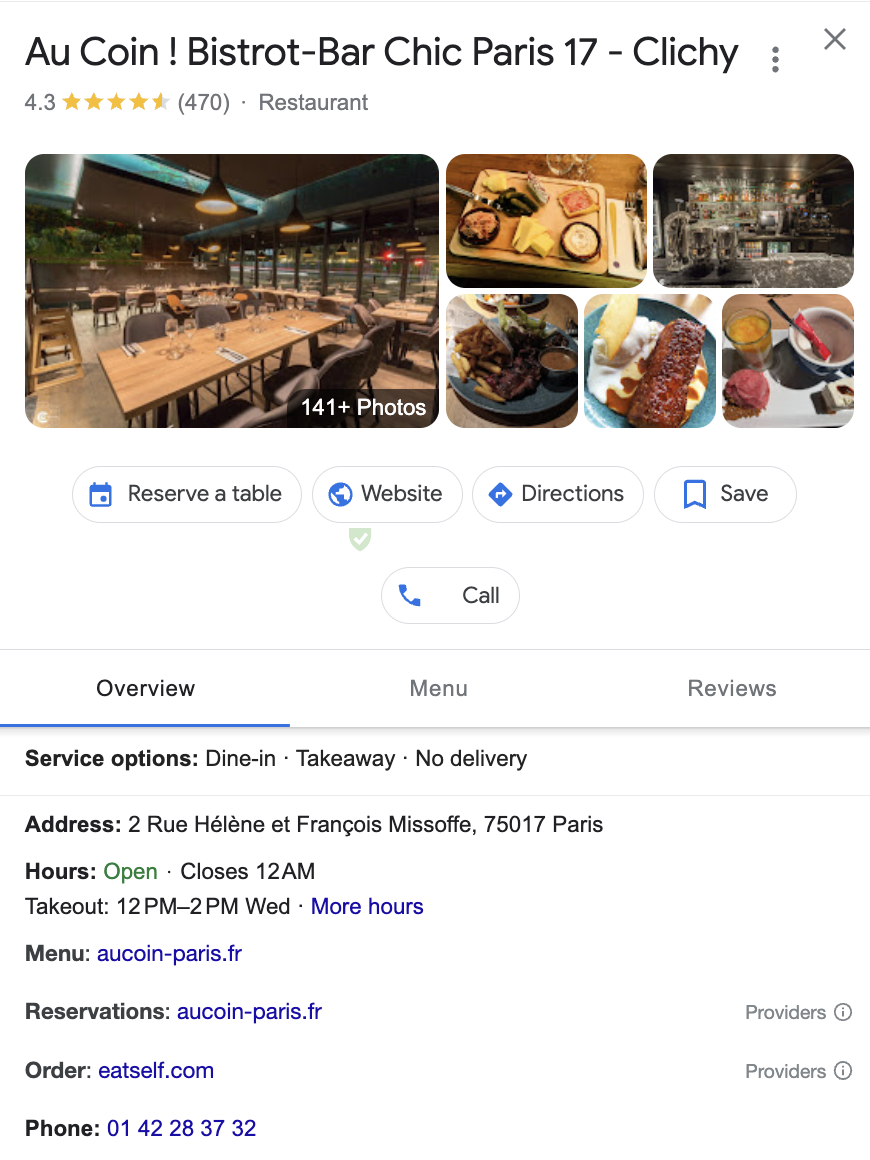 - Je Google My Business vermelding verschijnt aan de rechterkant, controleer of er een knop "tafel reserveren" is verschenen. Controleer ook of er een reserveringslink is toegevoegd.